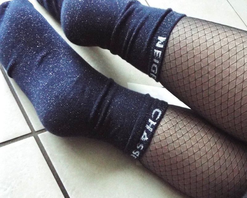 - Chaussettes bleues marine à paillettes: ces chaussettes ressemblent beaucoup à d'autres chaussettes que j'avais eu dans une Gambettes Box. Mais elles sont très belles et me plaisent avec les phrases "chasse neige" inscrite à l'arrière